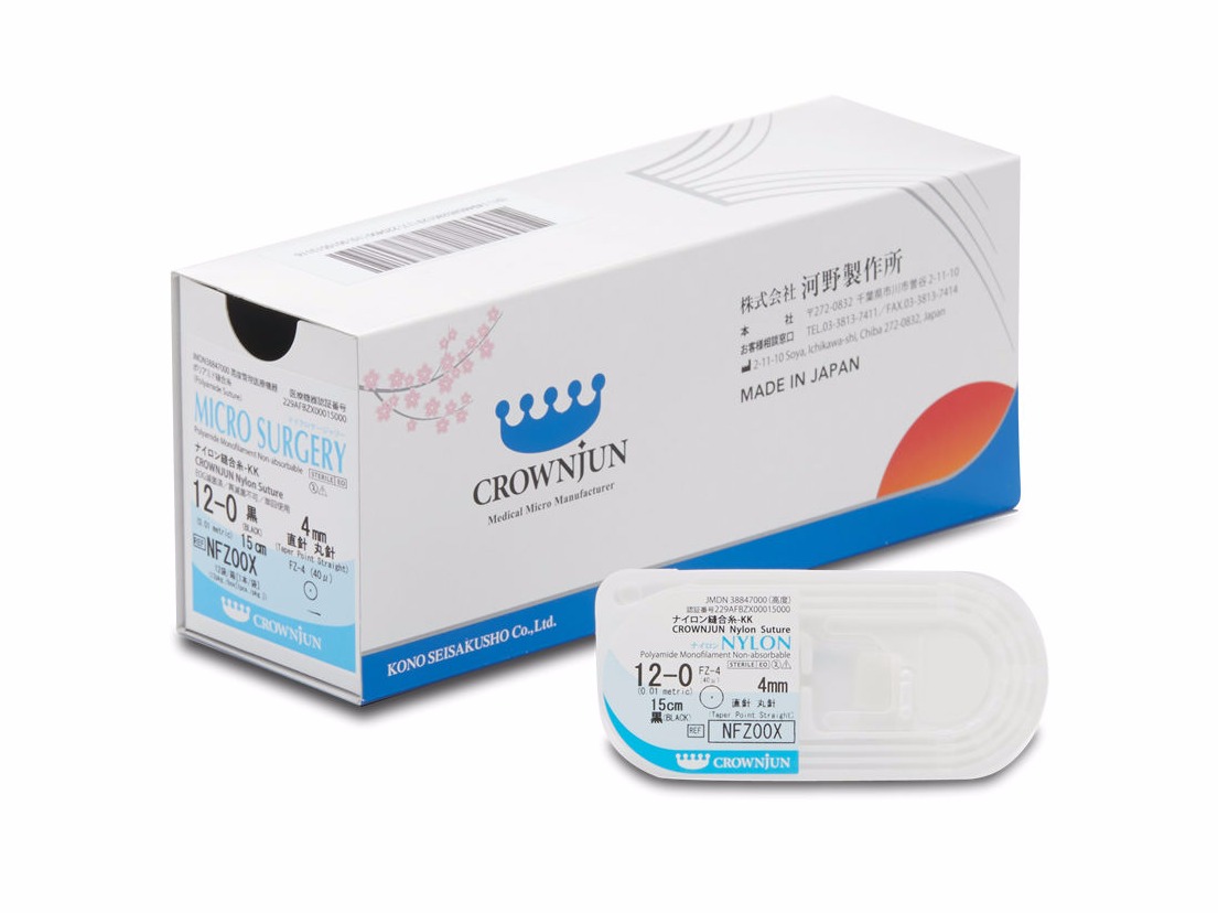 Kono Seisakusho manufactures microsurgery needles with attached micro nylon suture thread, in a range of sizes from USP 8-0 to USP 12-0.